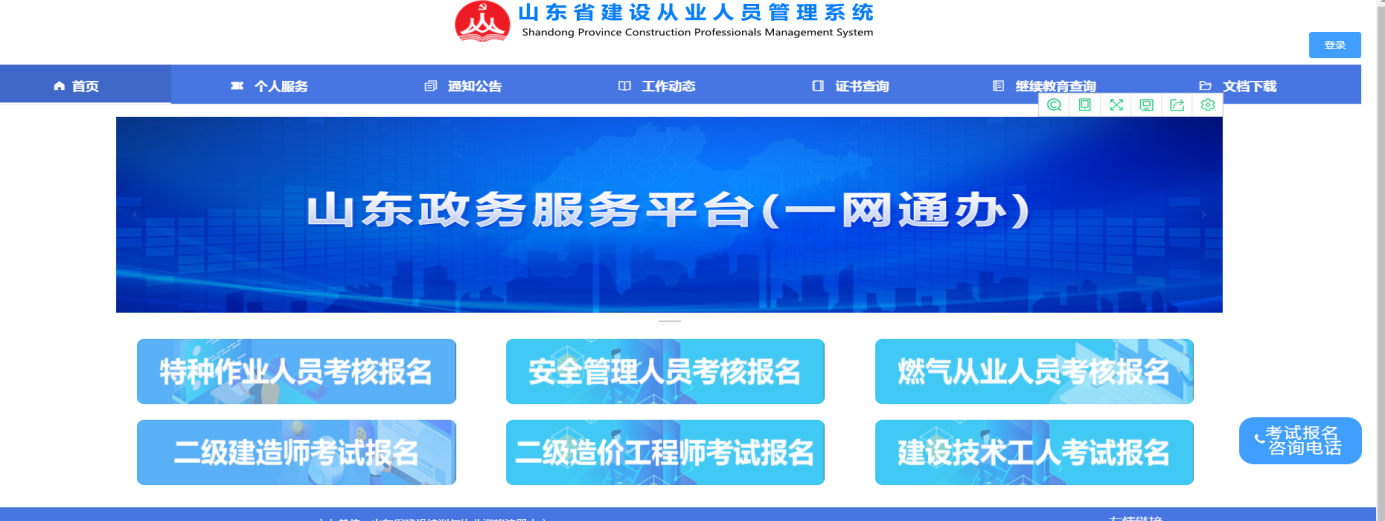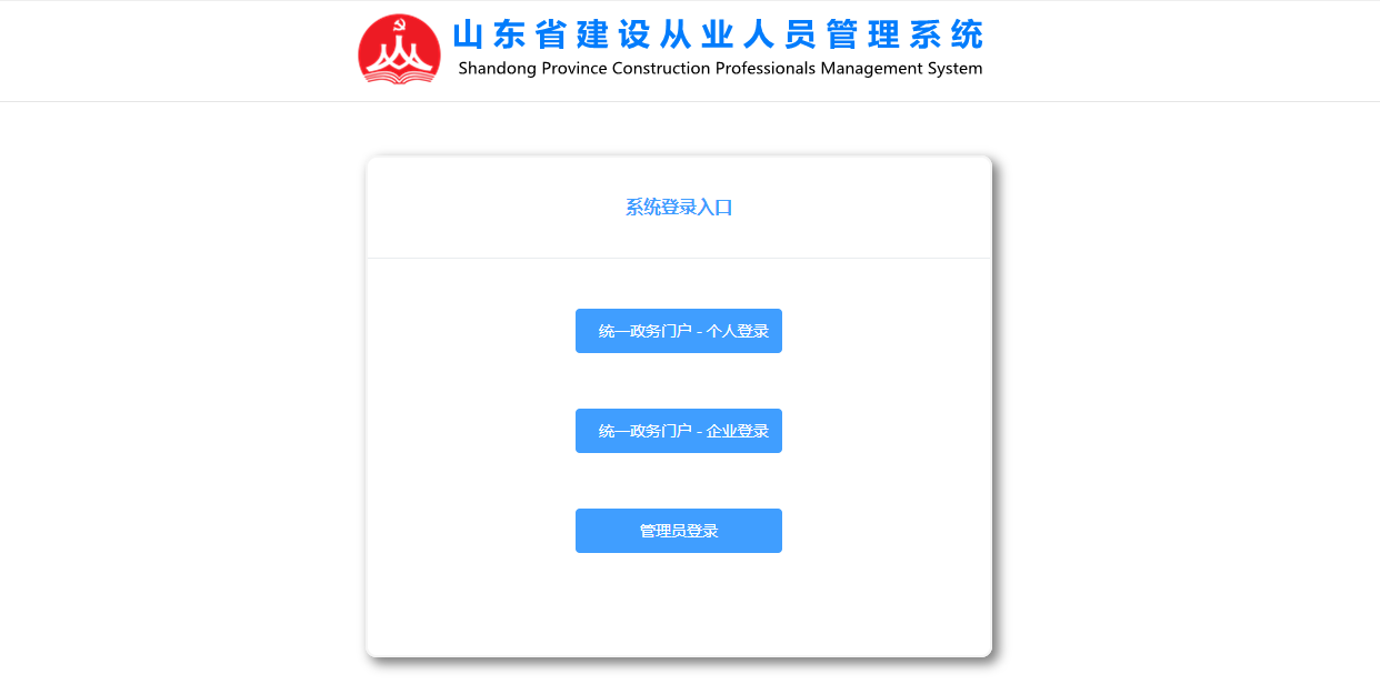 2.點(diǎn)擊《山東省建設(shè)從業(yè)人員管理系統(tǒng)》右上角的登錄-系統(tǒng)登錄入口-統(tǒng)一政務(wù)門戶-個(gè)人登錄,通過(guò)“山東省統(tǒng)一政務(wù)服務(wù)門戶”,進(jìn)行個(gè)人賬號(hào)登陸(持證人若無(wú)山東省人民政府網(wǎng)站的個(gè)人賬戶需要先在“山東省統(tǒng)一政務(wù)服務(wù)門戶”頁(yè)面注冊(cè))。