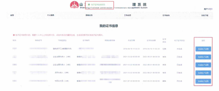 4.“我的證書(shū)信息”會(huì)顯示用戶在省廳系統(tǒng)下的所有證書(shū),點(diǎn)擊證書(shū)列表后的“生成電子證照”。