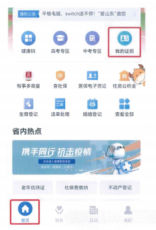 9.點(diǎn)擊首頁(yè)右上角的“我的證照”。