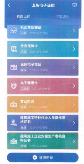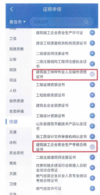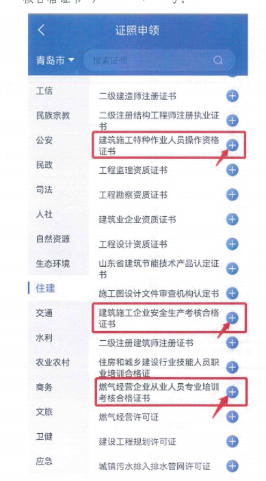 11.點(diǎn)擊“住建”-證書(shū)類型(建筑施工企業(yè)安全生產(chǎn)考核合格證書(shū))-“+”號(hào)。